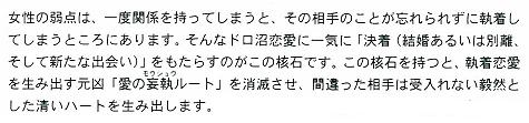 なんだかお昼のドラマみたいなタイトルですが、“愛の妄執ルート”という、ドロ沼恋愛の元を絶ち、幸せな恋愛を実現する、というものだったようです。